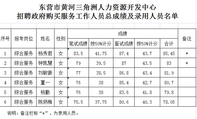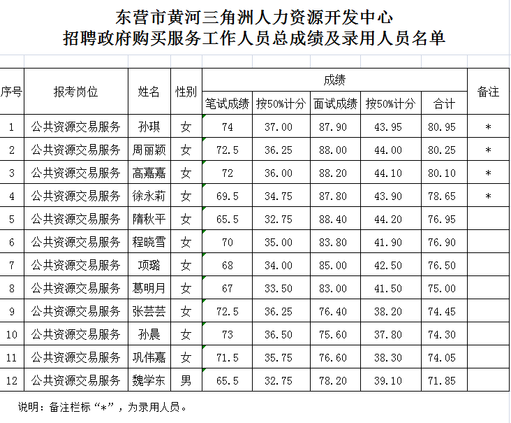 根據本次招聘活動的安排,現(xiàn)將進入面試人員的總成績及錄用人員名單予以公布。望被錄用人員按照統(tǒng)一規(guī)定和要求辦理相關錄用手續(xù)。