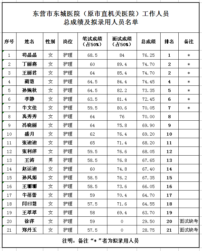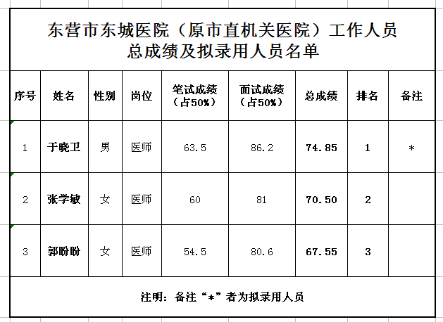 東營(yíng)市東城醫(yī)院(原市直機(jī)關(guān)醫(yī)院)招聘工作人員總成績(jī)及擬錄用人員名單的通知